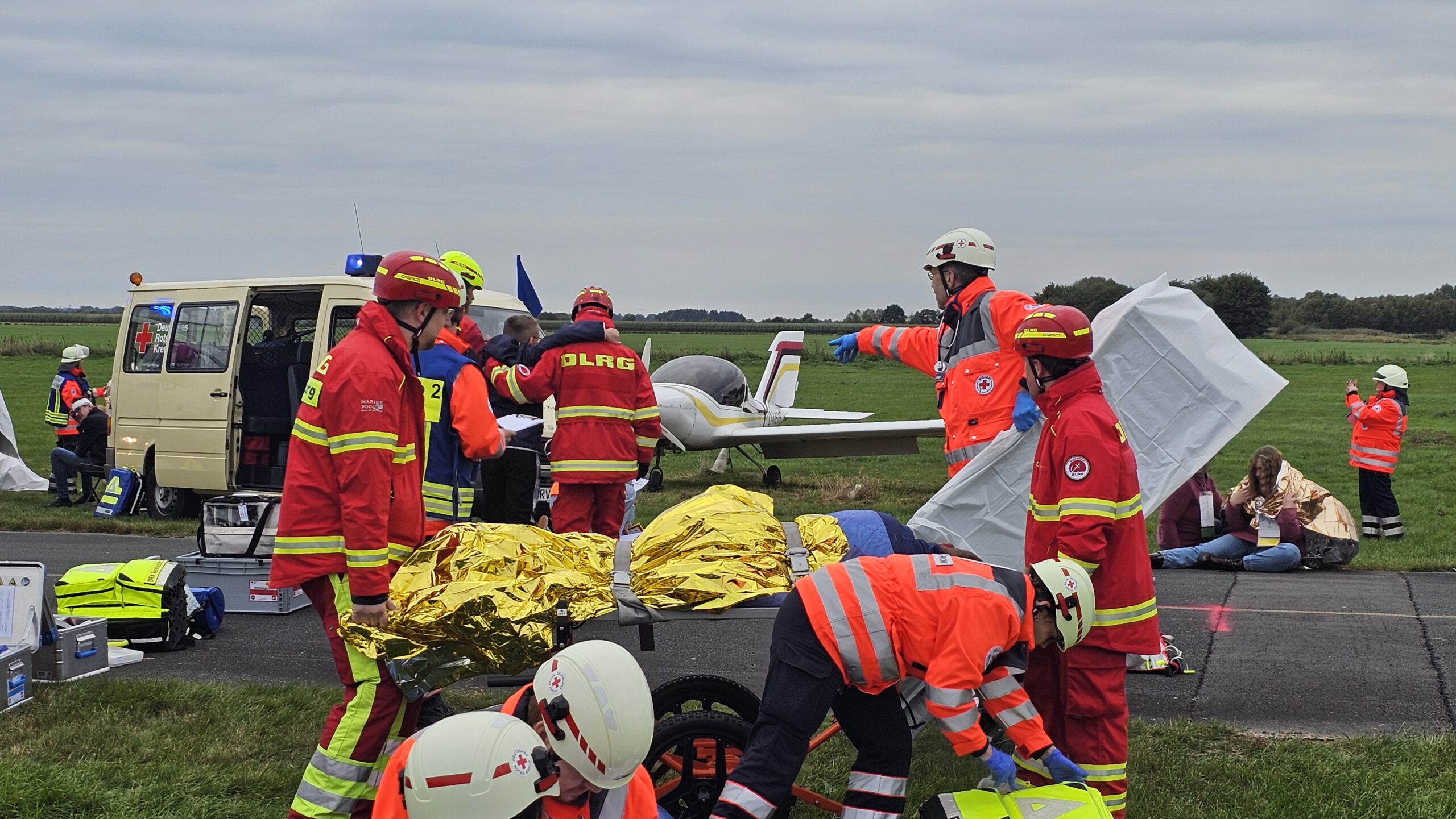 Etwa 60 Verletzte wurden gezählt, ein sogenannter Massenanfall von Verletzten, kurz ManV. Zusätzlich galten mehrere Personen als vermisst. Die abgeschiedene Lage des Flugplatzes stellte eine besondere Herausforderung dar. Während Patienten über die enge Zufahrtsstraße abtransportiert werden mussten, galt es gleichzeitig, eine Wasserversorgung über eine lange Wegstrecke aufzubauen. Um die Lage zu bewältigen, wurde die Einsatzstelle in mehrere Abschnitte gegliedert. Dazu gehörten die Brandbekämpfung am Flugplatz, die Wasserförderung für den Flächenbrand, die Vegetationsbrandbekämpfung sowie die Versorgung der zahlreichen Verletzten. Ergänzend wurden für die Personensuche Rettungshunde eingesetzt, während die Drohnengruppe den Luftraum überwachte und die Einsatzleitung mit Echtzeitbildern versorgte.