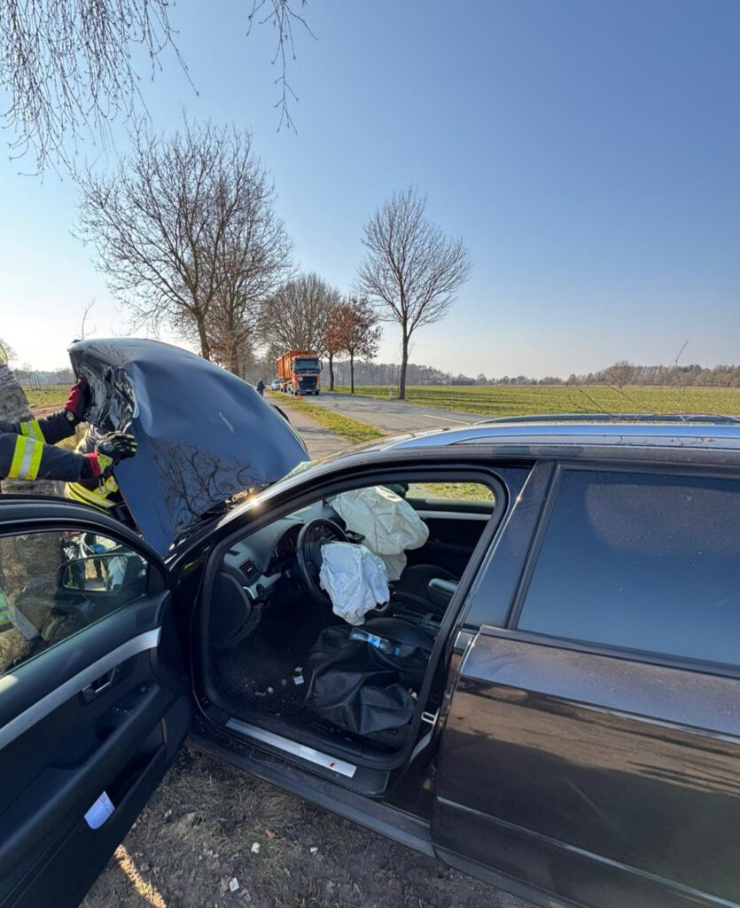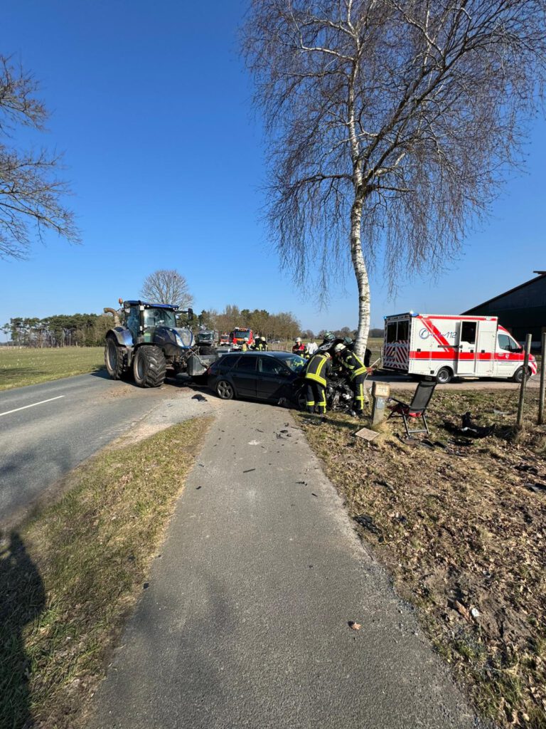 Nach Eintreffen am Einsatzort stellten wir glücklicherweise fest, dass der Fahrer des Audi’s sein Fahrzeug bereits verlassen konnte und nicht eingeklemmt war. Der Fahrer des Audi’s wurde vom Rettungsdienst versorgt und in ein Krankenhaus transportiert. Der Fahrer des Treckers blieb bei dem Unfall unverletzt und kam mit dem Schrecken davon.